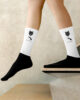 These socks are extra comfortable thanks to their cushioned bottom. The foot is black with artwork printed along the leg with crisp, bold colors that won’t fade.